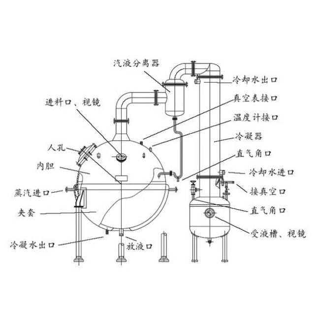 球形濃縮罐主要由濃縮罐主體、冷凝器、氣液分離器、受液桶四個部分組成,可用于制藥、食品、化工等行業(yè)對料液的濃縮、蒸溜及有機(jī)溶